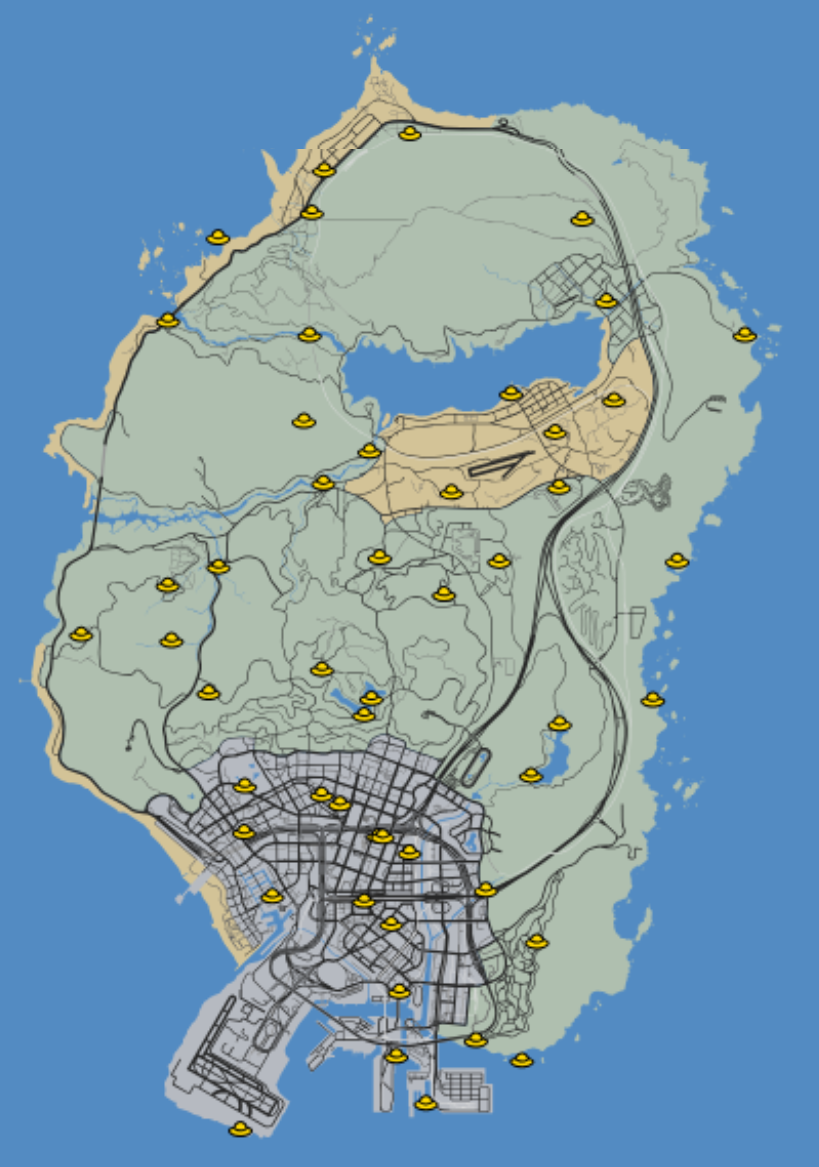 - Three UFO's that appear at the top of Mount Chiliad, Fort Zancudo and the Beam-Me-Up Hill in Sandy Shores